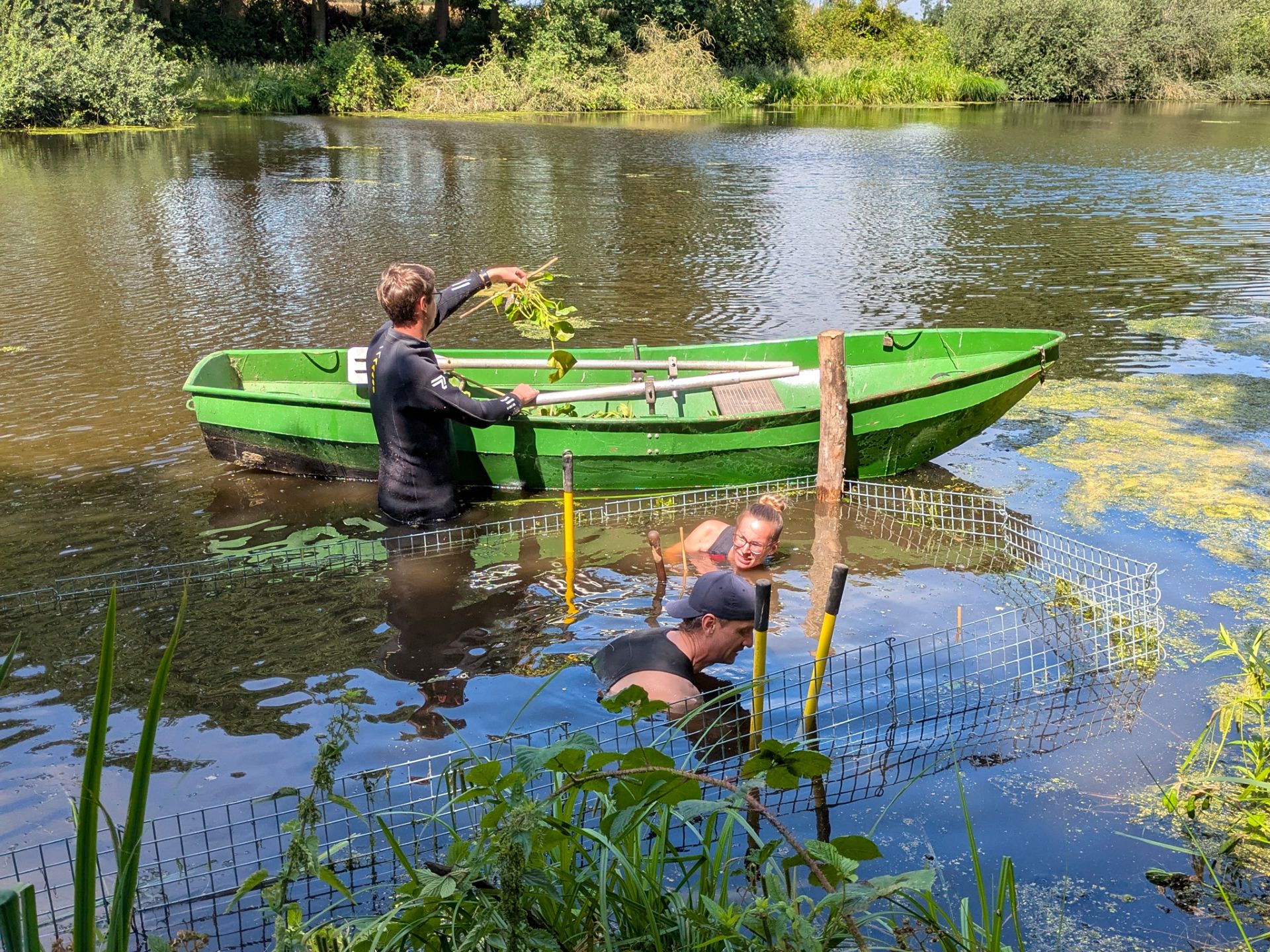 Zum Schutz der empfindlichen Jungpflanzen wurden an zwei geeigneten Stellen temporäre Schutzbereiche mit Gittermatten eingerichtet. Innerhalb dieser Zonen erfolgte die Pflanzung, sodass sich die Seerosen dort zunächst ungestört entwickeln können. Die fachliche Begleitung durch das Naturschutzzentrum, das über umfangreiche Erfahrung bei der Wiederansiedlung von Schwimmblattpflanzen verfügt, war ein zentraler Bestandteil des Projekts. Spaziergänger und Besucher werden durch ein Informationsschild an der vereinseigenen Anglerhütte über die Maßnahme informiert.